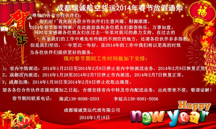 成都瑞誠空運2014年春節放假安排